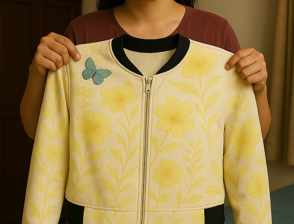 Design: Stylish bomber jacket with long sleeves, side pockets, and lycra ribbed hem and cuffs.